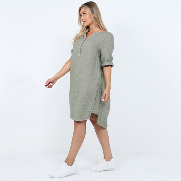Italian Diagonal Pockets Cotton Tunic Top - Olive